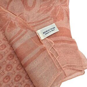 This sheer peach Nordstrom neck scarf is crafted from 100% silk, providing a luxurious and soft feel. Its elegant floral and geometric pattern adds sophistication to any outfit. Made in Italy, it embodies a timeless style and quality. Ideal for those seeking a chic accessory with a touch of elegance.