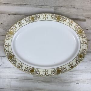 The Vintage Noritake 16" x 12" Oval Serving Platter 175 Christmas Ball Collection is a large and elegant serving dish made of porcelain, featuring a beautiful floral scroll pattern in cream gold color. This tray, with one compartment, is perfect for all occasions and comes from the renowned brand Noritake, manufactured in Japan. The shiny finish adds a touch of sophistication to any table setting, making it a timeless addition to your dinnerware collection.