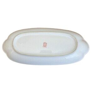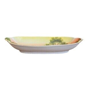 This vintage Noritake celery serving dish features a beautiful hand-painted scene of a lake house, with a green and yellow color scheme and a glossy finish. The dish is made of high-quality ceramic material and has a gold rim for added elegance. With a single compartment and a width of 5 inches, this oval-shaped dish is perfect for serving celery or any other side dish. It is a vintage original from Japan and is not antique. The item measures 12 inches in length, 1-1/2 inches in depth, and 1-3/4 inches in height. It is recommended to hand wash this dish only.