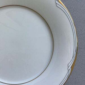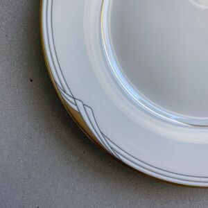 White china with gold trim and gray geometric line decoration