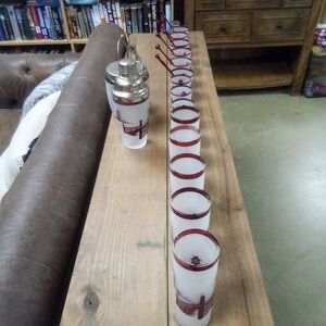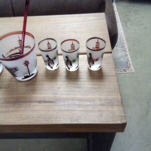 This vintage mid century modern barware set is fabulous! Frosted glass with ruby flash featuring images of Japanese scenery & Japanese girl