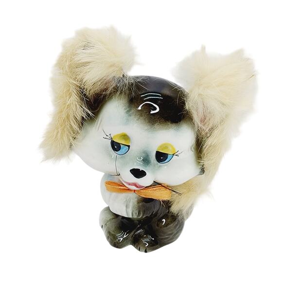 Cute little ceramic Kitty with furry ears & Tail. Has an Orange bow and a little whisker.