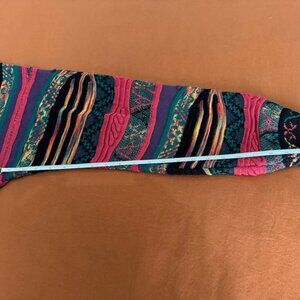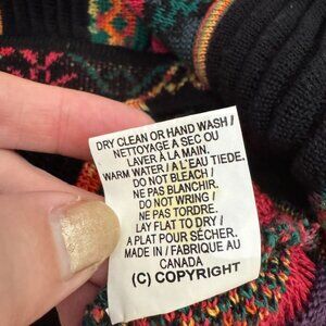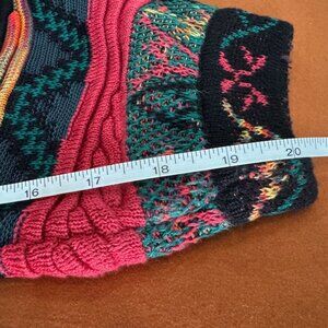 This pullover is characterized by a striking geometric multicolor pattern in shades of pink, green, purple, and black. Its vibrant geometric patterns and chunky-knit texture are reminiscent of the iconic Coogi style.