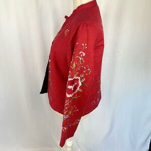 Norm Thompson beautiful vintage Red Silk floral Embroidered Jacket With Black Quilted Lining XL