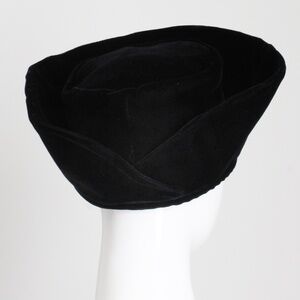 Preowned, vintage Norma Kamali high brim 'Cossack' style hat, likely made in the early 1990s. Made from black velvet, it features a high brim in front that crosses down to the back. It's fully-lined in black satin fabric.