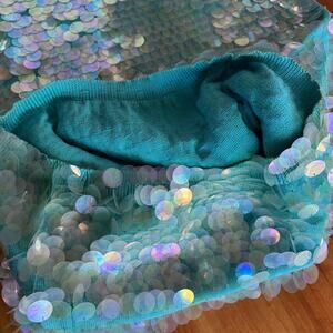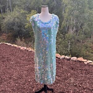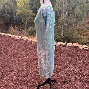 A jaw-dropping piece of fashion history from the queen of bold glamour, Norma Kamali. This rare vintage dress is drenched in oversized, iridescent paillettes that catch the light like shimmering mermaid scales—flashing seafoam green, turquoise teal with every movement.