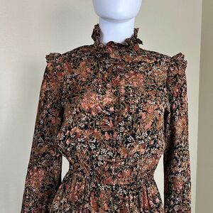 Vintage Norma Walter Women's Size 4 Floral Crepe Silk Ruffle Midi Dress Peasant
