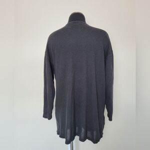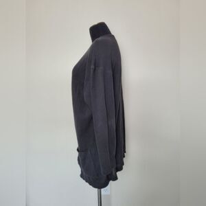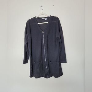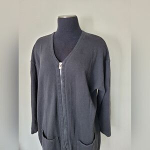 Perfect lightweight sweater jacket. All black lightweight cotton material, slightly sheer. Full Zip closure with pockets and full length sleeves. The ideal closet staple for transitional weather. Great condition. Tagged size large measures approximately 30 inches long 23.5 inches underarm to underarm laid flat.