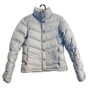 Features long sleeves, elastic cuffs, zip front closure with snap buttons, zipper front pockets, water and wind resistant, 700 fill power goose down, in sky blue nuptse