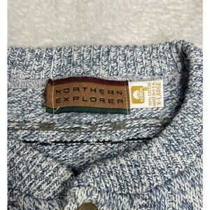 Vintage Northern Explorers Textured Knit Blue Henley Sweater Men's Size XL. A few spots of discoloration on the sweater. Please see pictures for condition and measurements for proper sizing and fit.