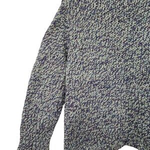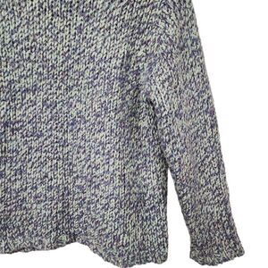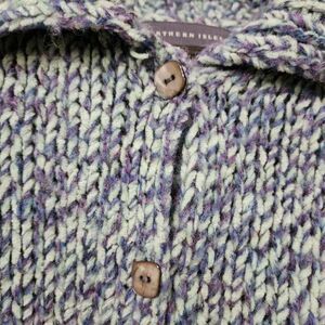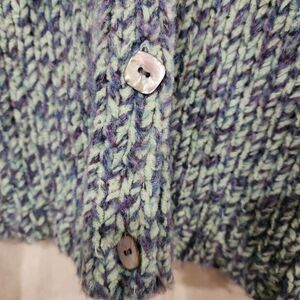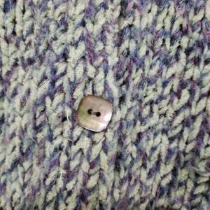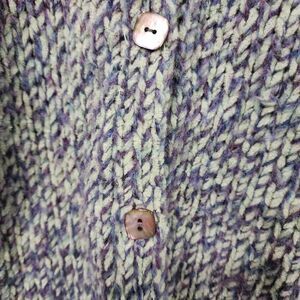 Vintage Northern Isles Variegated Knit Cardigan With Shell Buttons. colors are variations of blue with some purple. buttons are square and made of shell.