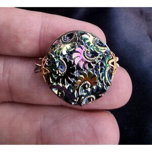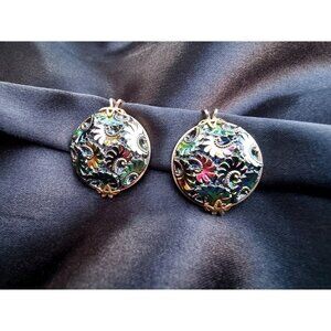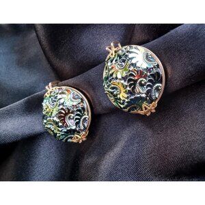 These vintage clip-on earrings feature the mesmerizing colors of Northern Lights carnival glass. The glass has a beautiful, iridescent glow, shifting between shades of blue, purple, green, and gold as the light catches it. Set in a secure clip-on style, they bring a radiant sparkle and an eye-catching, vintage charm—perfect for adding a pop of color and shine to any outfit without needing pierced ears!