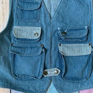 Classic denim vest with striped collar. Ideal for layering. Size xl. In good vintage pre owned condition. Super cute vest! 100% cotton
