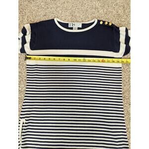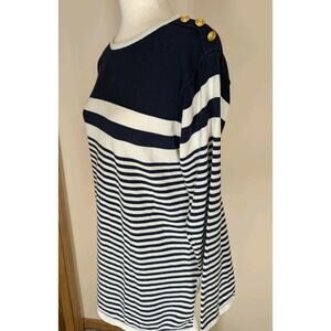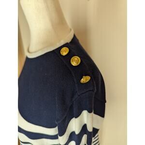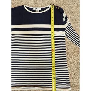 Flat lay measurements - Pit to pit: 20 inches Shoulder to hem: 27 inches Sleeve length: 21 inches This vintage Norton Studio sweater in women's size small features a classic navy and white Breton striped pattern, perfect for a nautical-inspired look. The pullover style sweater has long sleeves and a round neck, with a gold on the shoulder adding a stylish touch. Made from a cotton blend knit fabric, this pre-owned garment is in excellent condition, suitable for machine washing. The stretchy material provides a comfortable fit, making it a versatile and timeless addition to any wardrobe.