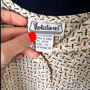 Serving serious retro realness, this vintage Notations blouse features a micro-abstract print in black, tan, and ivory with a classic navy collar, cuffs, and banded waist. The slightly boxy silhouette gives effortless ‘80s/‘90s energy and looks so cute tucked or worn loose. Tag reads size 14, best fits like a modern Large. Excellent vintage condition with no flaws.