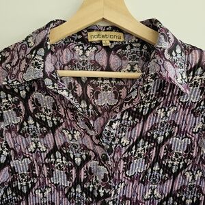 This vintage Notations blouse features a beautiful purple paisley pattern with pleated details and bell sleeves. It is a long sleeve, button-up top with a classic collared neckline. Lightweight bd semi-sheer.
