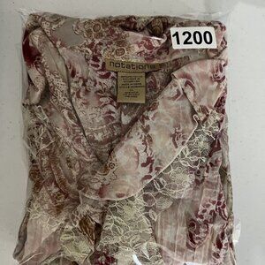 In a world where style meets nostalgia, this Vintage Notations blouse tells tales of elegance and charm. The intricate floral patterns dance across the sheer fabric, whispering secrets of a bygone era. The ruffled neckline adds a touch of whimsy, while the flowing sleeves promise comfort in every movement.