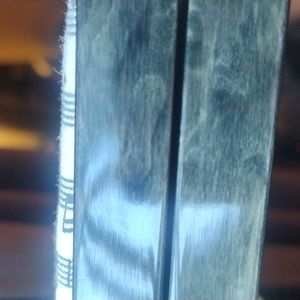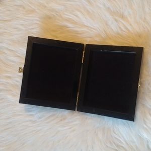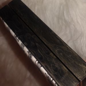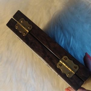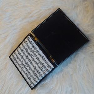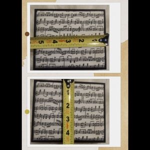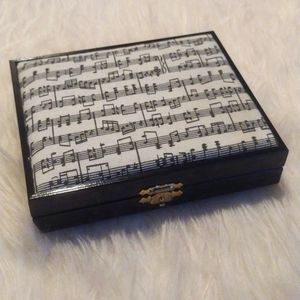 This adorable little box is made with "fine Italian wood moulding," that almost looks like a marbleized green/black wood grain color (2 pictures taken to show color-1 with flash), gold tone hinges, along with a clasp to close on the front, complete with a padded cloth top adorned with white and black music notes. Initially made probably to hold note pad paper but could be used to keep anything safe, such as change, jewelry, keepsakes and more. Made by FG Galassi and has a certificate inside explaining its hand crafted (in the US) origin. Has one nick in the wood that could easily be covered up. Inside and bottom black material is like a jewelry box lining, possibly velveteen.