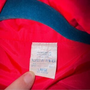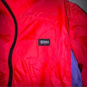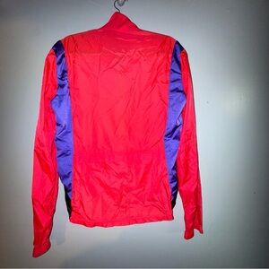 Great used condition wind breaker. No signs of wear side large. Had front pockets and back zipper pocket. Very Bright Red, black, purple/blue color
