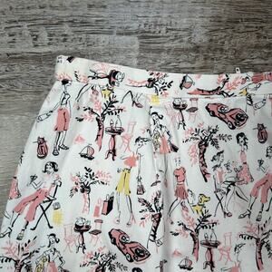 Adorable retro-inspired skirt with a playful novelty print featuring mid-century modern women, pink convertibles, martinis, and palm trees. Soft cotton with a touch of stretch, featuring a side zipper and light pleating. A rare and whimsical piece perfect for vacations, brunch, or vintage lovers.
