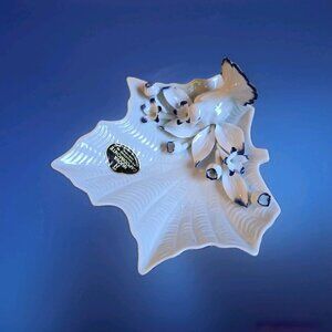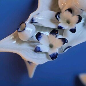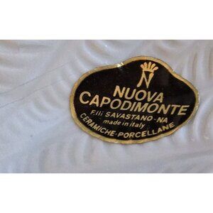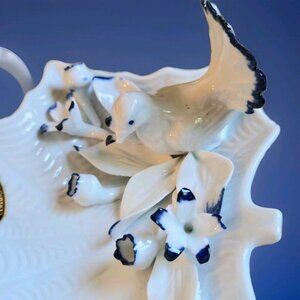 This Vintage Nuovo Capodimonte Filli Savastano Porcelain white bird dish is trimmed in navy blue and white. It is a charming decorative collectible piece. Crafted from fine porcelain this dish features a delicate design of a dove amongst hand crafted flowers, adding a touch of elegance to any home decor. The classic blue and white color scheme gives it a timeless appeal, making it a welcome addition to any collection of decorative items. Perfect for displaying on a shelf console table or end table this piece is a lovely representation of fine Italian vintage craftsmanship.
