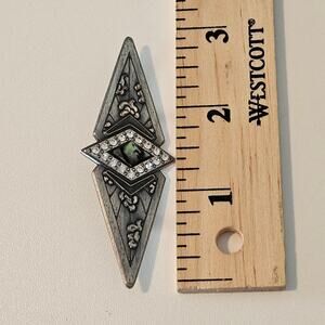 Vintage Nuri diamond shaped brooch. Silver multi layer brooch featuring engraved design. Center top layer is abalone surrounded by rhinestones.