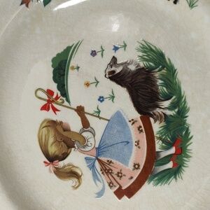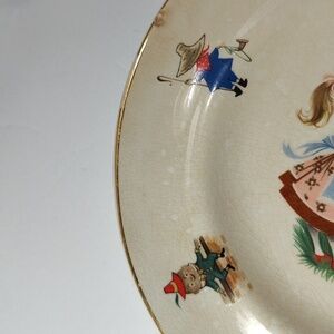 Adorable Vintage Nursery Rhyme Ceramic Plate. Arklow Brand, Made in Republic of Ireland. Some Cracking in the glaze, 1 chip in the rim ( pictured) and discoloration from age. Gold Trim trim. So cute !!!
