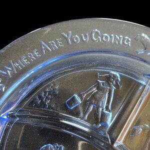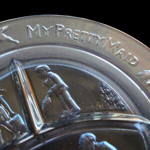 This charming vintage child's plate features the beloved nursery rhyme "See-Saw Margery Daw." Crafted from delicate blue glass, it showcases intricate embossed illustrations, offering a nostalgic glimpse into classic childhood tales. A lovely addition to any collection of vintage nursery items or decorative glassware.