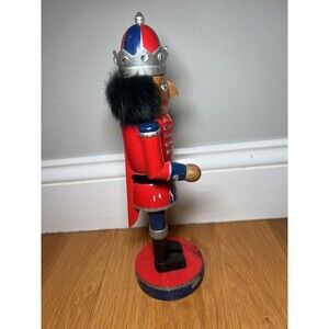Item: Nutcracker Prince wooden soldier decorative figure with crown and round base.