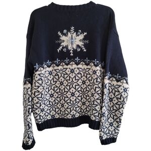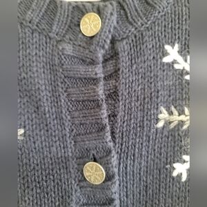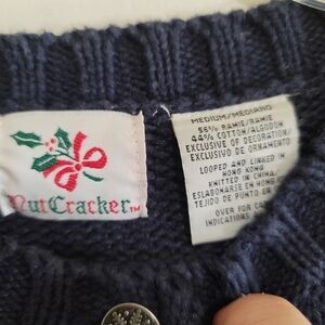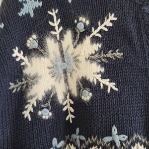 Vintage Nutcracker Winter Snowflake Sweater Cardigan. Blue and White. Metal Snowflake buttons. Snowflakes have fuzzy texture to them. Great condition, no stains or holes.