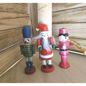 Add a touch of vintage charm to your Christmas tree with this set of three hand-painted wooden nutcracker soldiers. These ornaments are perfect for anyone who loves traditional Christmas decorations and wants to add a unique touch to their collection. Each ornament measures between 3.5 and 4 inches in height and 1.5 inches in width, making them small and easy to hang on any branch.