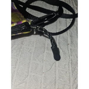 Pre-owned Vimtage crossbody bag. The bag features a fabric exterior with a wavy purple green pattern. It has a black fabric interior, zipper closure, and an adjustable black nylon strap with carabiner clips. Good preowned condition. Measurements in pictures are approximate. Made in the USA.