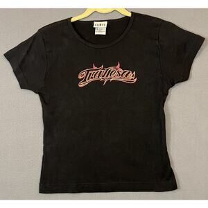 Vintage ODM Latina Glitter Shirt Traviesa Tight Crop In Size Large. Shirt is purposefully small. Please check the measurements against a snug shirt that you like.