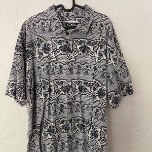 Vintage OP Hawaiian Print Button Down Shirt - Dark Blue Print on White (Large)