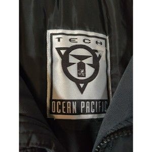 Elevate your casual look with this vintage Ocean Pacific Tech jacket. Crafted from durable nylon, this black puffer jacket features a zip, snap, and drawstring closure, making it perfect for any occasion. The hood and water-resistant feature make it ideal for snowy weather, while the pockets provide ample storage space. This men's large size jacket is machine washable for easy care, and it comes with no personalized prints or handmade designs. Add a touch of snowboard cool to your wardrobe with this classic OP jacket.