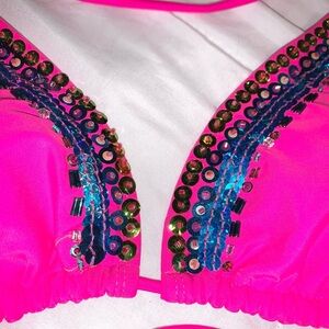 Bright pink bikini top with colorful sequin embellishments. Perfect for a bold beach look.