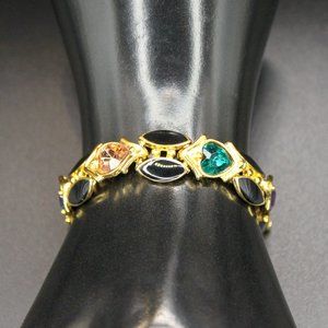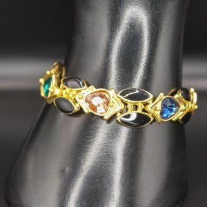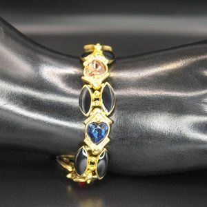 Luxurious, absolutely gorgeous vintage signed Orena Paris link bracelet with colorful sparkling heart-shaped rhinestones in five colors, and classic black enamel in gold tone metal. This bracelet measures approximately 7 inches long and is about 1/2 inch wide.