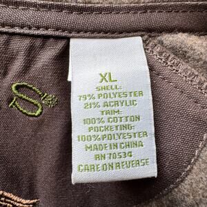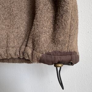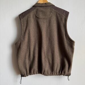 Details: Vintage ORVIS men's brown fleece sportsmans vest with front zipper closure, brown cotton details, one zippered chest pocket, two zippered side seam pockets, and adjustable elastic hem.
