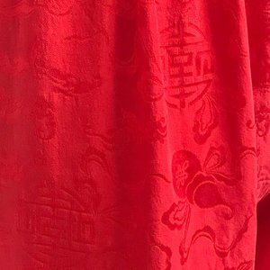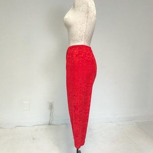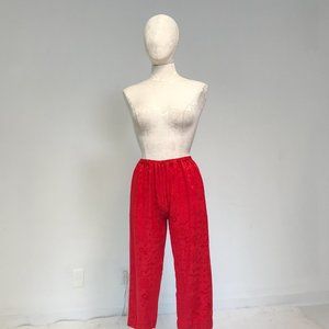 Vintage Red 100% Silk Pants w jacquard Chinese symbols woven print. Elastic waist, high rise, straight leg. Relaxed comfortable for social distancing in style, lounging at home or hanging out. Would look great w cropped top for a modern look. EUC