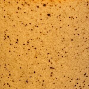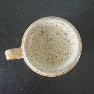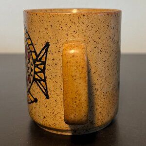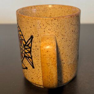 Vintage Otagiri tan stoneware mug features a slightly embossed stylized fish on one side and a stylized floral pattern on the other, both in burnt red, and two tones of yellow outlined in dark brown. The exterior, interior, handle, and underside are all generously covered with the signature Otagiri brown speckles. Rectangular shaped handle. Measures 3.5” tall with a 2.75” diameter; 4” across including handle. Holds 8 fluid oz.