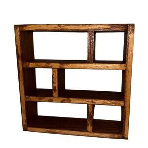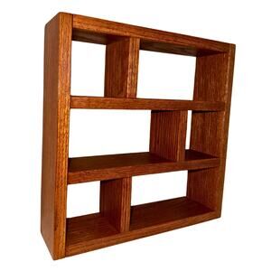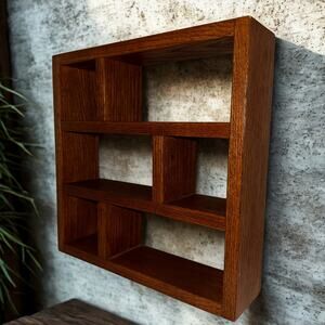 A beautiful handcrafted oak wood cubby shelf perfect for displaying your favorite mini treasures, essential oils, collectibles, or farmhouse décor accents. The natural wood grain and geometric cubby layout add cozy warmth and mid-century charm to any wall or tabletop.