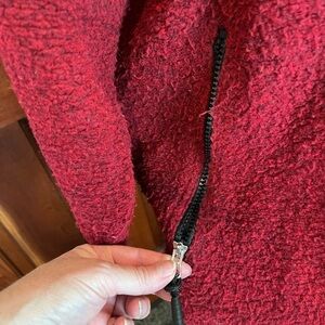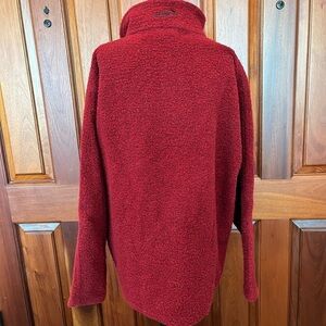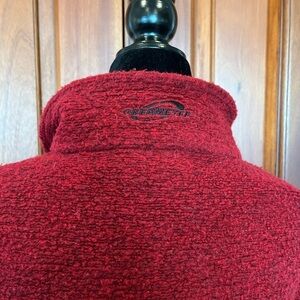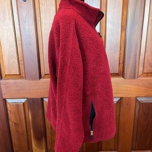 Heavier weight fleece like sweater. 42% acrylic, 40% polyester, 18% wool