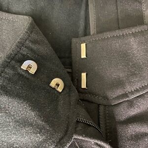 Black; 2” V-shaped waistband; front zippered pocket; zip fly w/ double hook and eye closure; additional side hook and eye closure; small heart detail under waistband; stirrups on the bottom