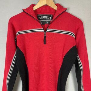 Vintage 90s Obermeyer women's pull-over sweater with 1/4 zip neckline. Red and black with sporty gray and white stripes along the arms and chest. 30% Wool, 70% Acrylic. Made in Hong Kong.
