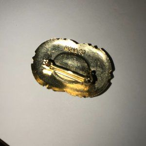 Mona So Black and gold Pin. This is a Vintage signed pin. It has a oval black stone in the center of an oblong pin.