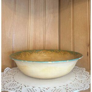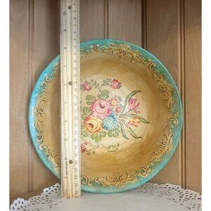 This hand-painted decorative bowl features a vibrant floral design, accented with intricate turquoise and yellow patterns. Ideal as a centerpiece or display decor.