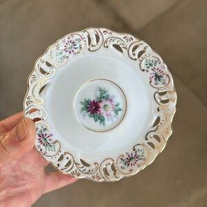 Charming miniature teacup with pink flowers design. Rich pink and gold accents. Perfect for collectors or use as espresso cup. The plate has cute cutouts and gold borders. Trimont china made in occupied Japan. About 1.5” tall cup.