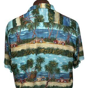 Vintage Ocean Current Hawaiian Shirt Mens XL Old Cars Palm Trees Beach Scene
