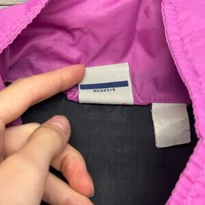 Purple pink black colorblock half-zip front, adjustable hood, and classic kangaroo pocket. Lightweight 90s streetwear, nylon shell, lightweight jacket, rare OP jacket, throwback outerwear, retro transitional jacket.