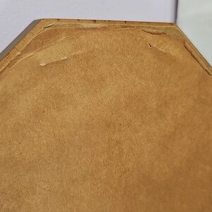 Elegant octagonal frame with a classic portrait. Features gold leaf background. Blue dress detail adds contrast.